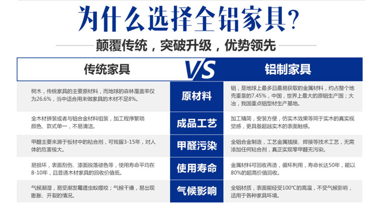 全鋁家具從原材料和產(chǎn)品生產(chǎn)各個環(huán)節(jié)中,相對于木質(zhì)家具沒有甲醛殘留!對水源沒有污染,而且在家庭使用中,大家不用擔(dān)心因?yàn)榧兹╅L期釋放對家人的健康產(chǎn)生威脅!讓家庭生活更加快樂和諧!